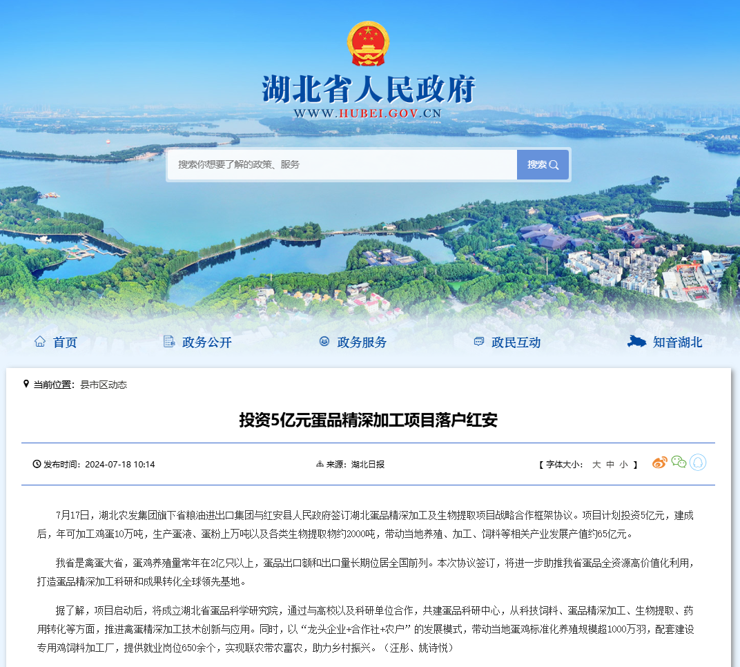 湖北省人民政府:投資5億元蛋品精深加工項(xiàng)目落戶紅安