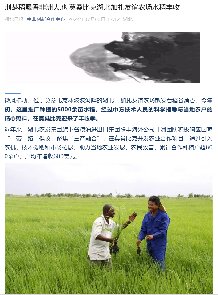 中非創(chuàng)新合作中心:荊楚稻飄香非洲大地 莫桑比克湖北加扎友誼農(nóng)場水稻豐收