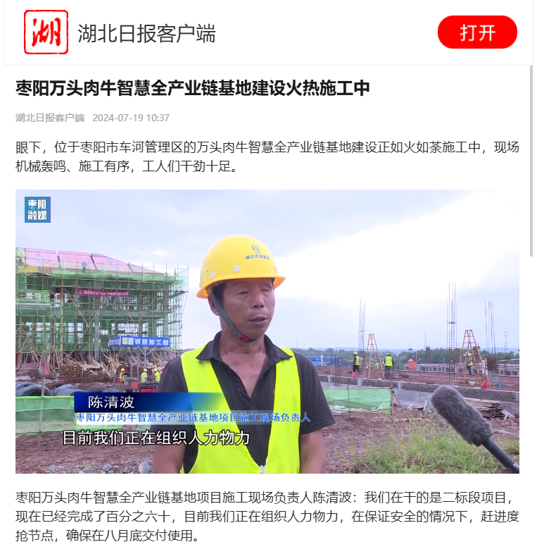湖北日報:棗陽萬頭肉牛智慧全產(chǎn)業(yè)鏈基地建設火熱施工中