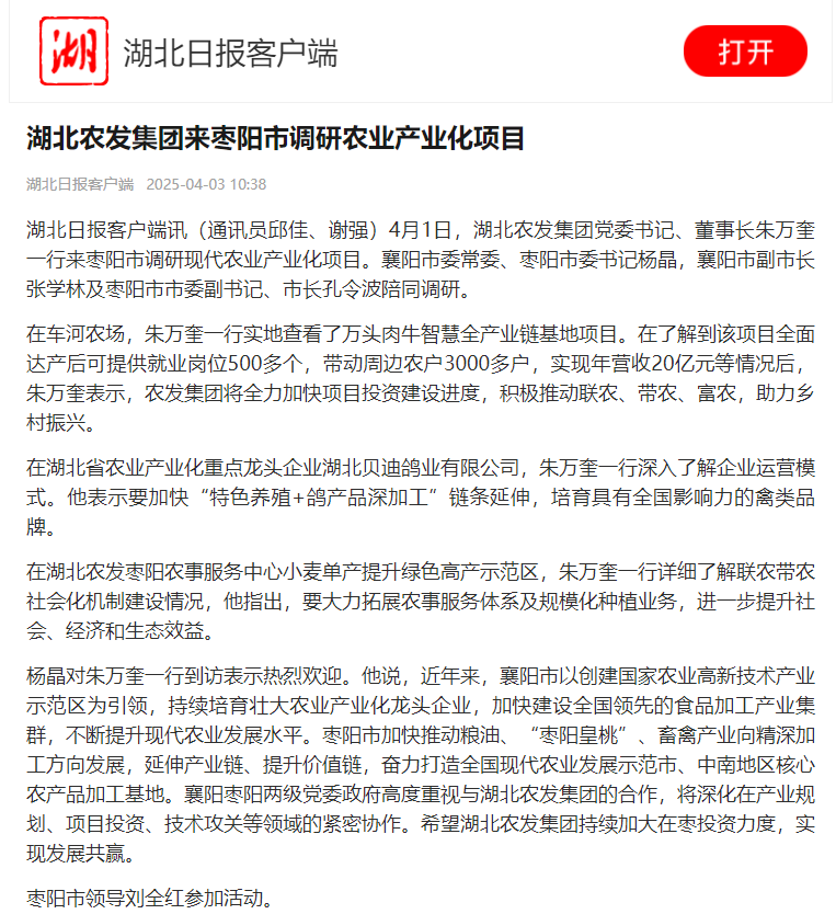 湖北日報:湖北農(nóng)發(fā)集團來棗陽市調(diào)研農(nóng)業(yè)產(chǎn)業(yè)化項目