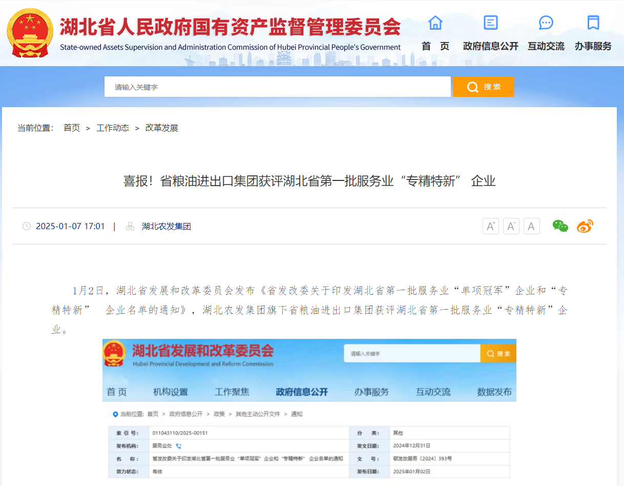 湖北省國資委:喜報!省糧油進出口集團獲評湖北省第一批服務(wù)業(yè)“專精特新” 企業(yè)